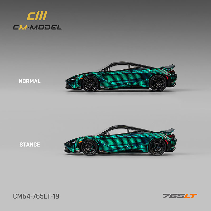 CM-MODEL(CMモデル)、スケール1/64(全長7cm)、パッケージ(6cm×12cm×5cm)、クロームグリーンド/フルカーボン、ITEM#CM64-765LT-19