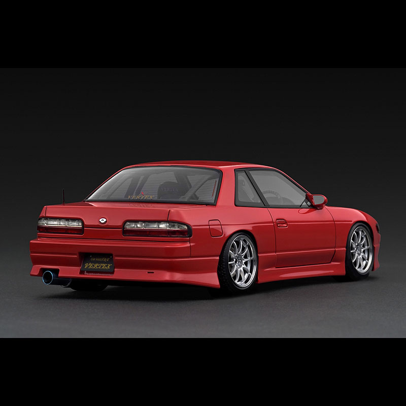 「VERTEX S13 Silvia 」をレジンモデルで再現。CE28Nタイプ 17インチホイール(ポリッシュ&シルバー)にローダウン仕様。VERTEX製エアロパーツ(フロントバンパー、サイドステップ、リヤバンパー)を装着。フロントウィンドウハチマキとリヤウィンドウ下部に「VERTEX」ロゴ、大径シングルマフラー(チタンカラー)、VERETX製品バケットシート、VERTEX製ステアリングを装着など魅力満載のモデル。