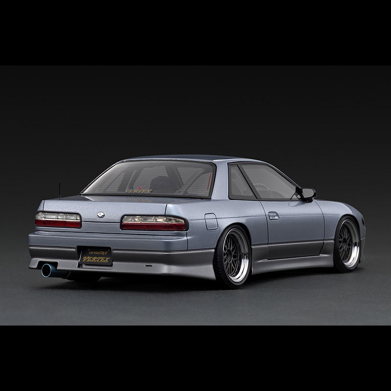 「VERTEX S13 Silvia 」をレジンモデルで再現。BBS LMタイプ 17ンチ(ポリッシュ&ガンメタリック)にローダウン仕様。VERTEX製エアロパーツ(フロントバンパー、サイドステップ、リヤバンパー)を装着。フロントウィンドウ上部とリヤウィンドウ下部に「VERTEX」ロゴ、大径シングルマフラー(チタンカラー)、VERETX製品バケットシート、VERTEX製ステアリングを装着など魅力満載のモデル。