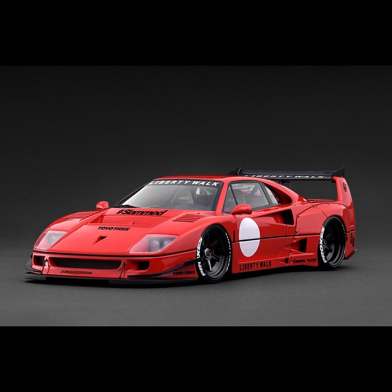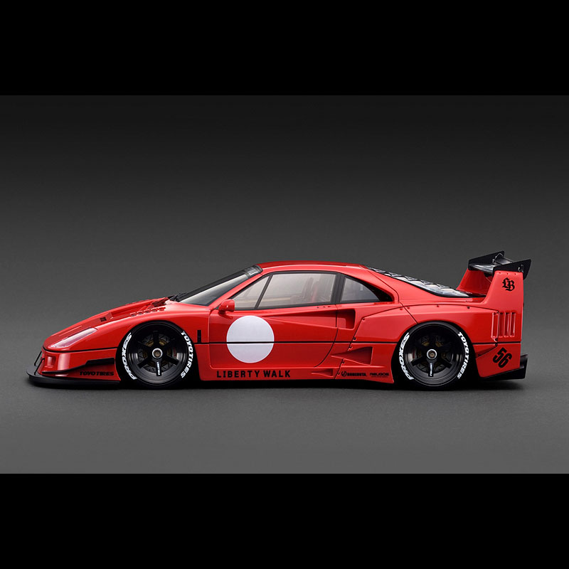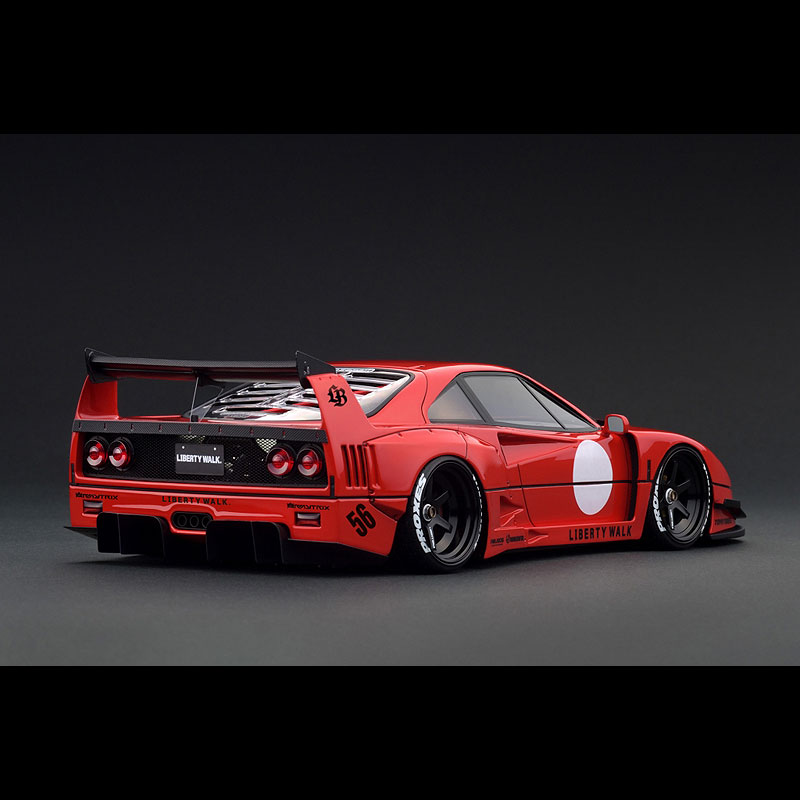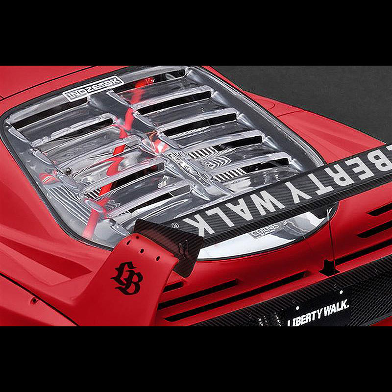 リバティウォークのデモカー「LB-WORKS 40」をレジンモデル素材でモデル化。LB-worksオリジナル6本スポーク18インチホイール(ブラック)に専用ボディキット(フロントリップスポイラー、フロントカウル、リヤワイドフェンダー、リヤウィング、リヤディフュ—ザー、カナード)、ボディの各所に専用デカール、内装に専用バケットシート、LB-worksオリジナルステアリング、ロールバーを装着。リヤハッチの内部に収まるV8ツインターボエンジンを詳細に再現したモデル。