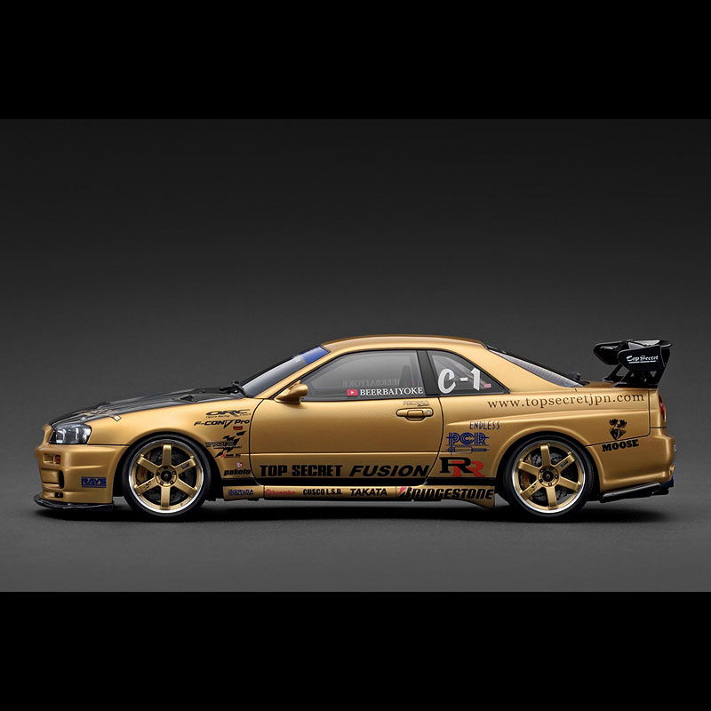 トップシークレットのタイ法人「Top SecretThailand」が所有するデモカーをモチーフにした「TOP SECRET 34GT-R(BNR34)」をレジンモデルで再現。TE37タイプ18インチホイール(ポリッシュ&ゴールド)にローダウン仕様。専用エアロパーツ(フロントバンパー、サイドステップ、エアロミラー、リヤアンダーディフューザー)、GTウィング、カーボンボンネット、大径マフラー、ボディの各所に専用デカール、大型ブレーキキャリパー、専用ステアリング、専用バケットシート、ロールバーを装着など魅力満載のモデル。
