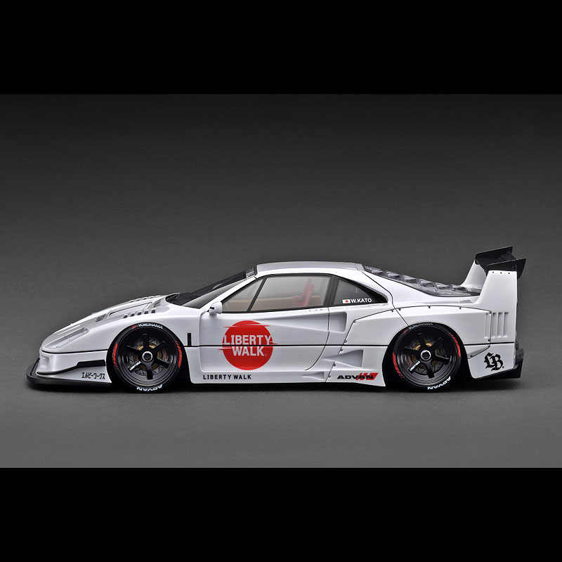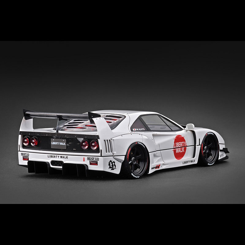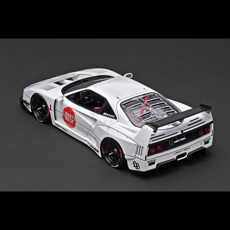 リバティウォークのデモカー「LB-WORKS 40」をレジンモデル素材でモデル化。2023年の東京オートサロンで発表され話題をさらった同車両ですが、今回、最新のカラーリングを纏ったアップデート仕様を3Dスキャニング取材し、内外装の細部を忠実に再現しました。LB-worksオリジナル6本スポーク18インチホイール(ブラック)に専用ボディキット(フロントリップスポイラー、フロントカウル、リヤワイドフェンダー、リヤウィング、リヤディフュ—ザー、カナード)、ボディの各所に専用デカール、内装に専用バケットシート、LB-worksオリジナルステアリング、レッドのロールバーを装着。リヤハッチの内部に収まるV8ツインターボエンジンはクリヤーカバーのルーバー超しに眺めて楽しんでいただけるよう、詳細に再現しました。