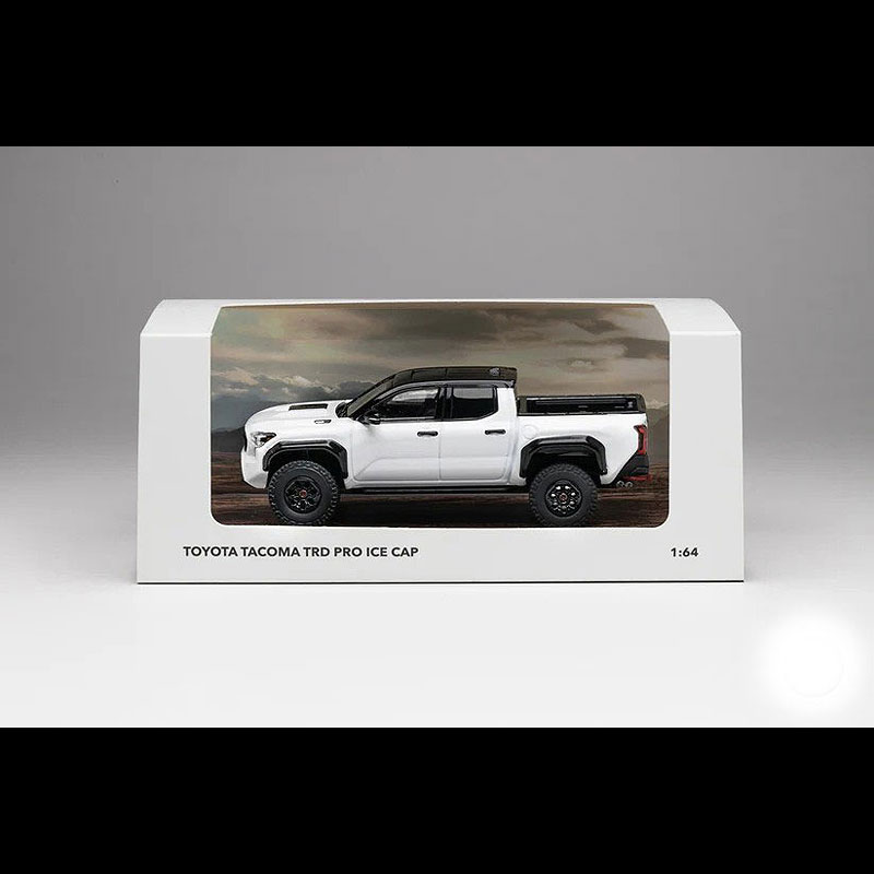 オフロード性能に定評のあるTacoma TRD PROを1/64スケールで精密再現したDiecastTalk特注モデル。ワイドで力強いボディ造形に加え、TRD PRO専用装備を忠実に落とし込み、実車のタフな印象をコンパクトなサイズに凝縮しています。清潔感と存在感を兼ね備えたICE CAP WHITEのボディカラーが、無骨なピックアップスタイルを一層引き立てます。アウトドアやオフロード系コレクションに最適な、完成度の高い特注ダイキャストモデルです。