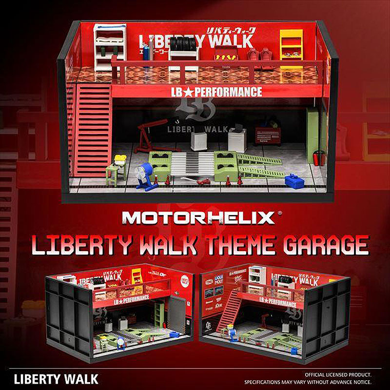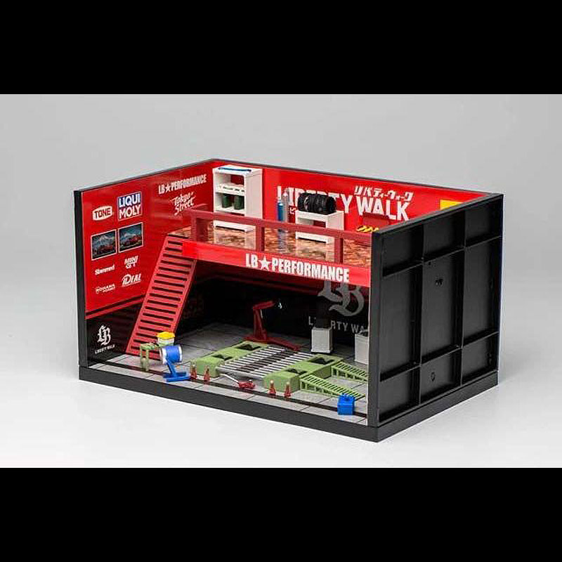 世界的カスタムブランド「LIBERTY WALK」の世界観を1/64スケールで再現した、MOTORHELIX製のテーマガレージジオラマ。LB PERFORMANCEのロゴやサイン、ツール類、作業スペースまで細かく作り込まれており、ミニカーを置くだけで本格的なガレージシーンを演出できます。ガレージ内部は立体感のある構造で、展示用としてはもちろん、撮影用の背景としても存在感抜群。LB仕様の車両との相性はもちろん、1/64スケールのスーパーカーやカスタムカーを引き立てるディスプレイアイテムです。